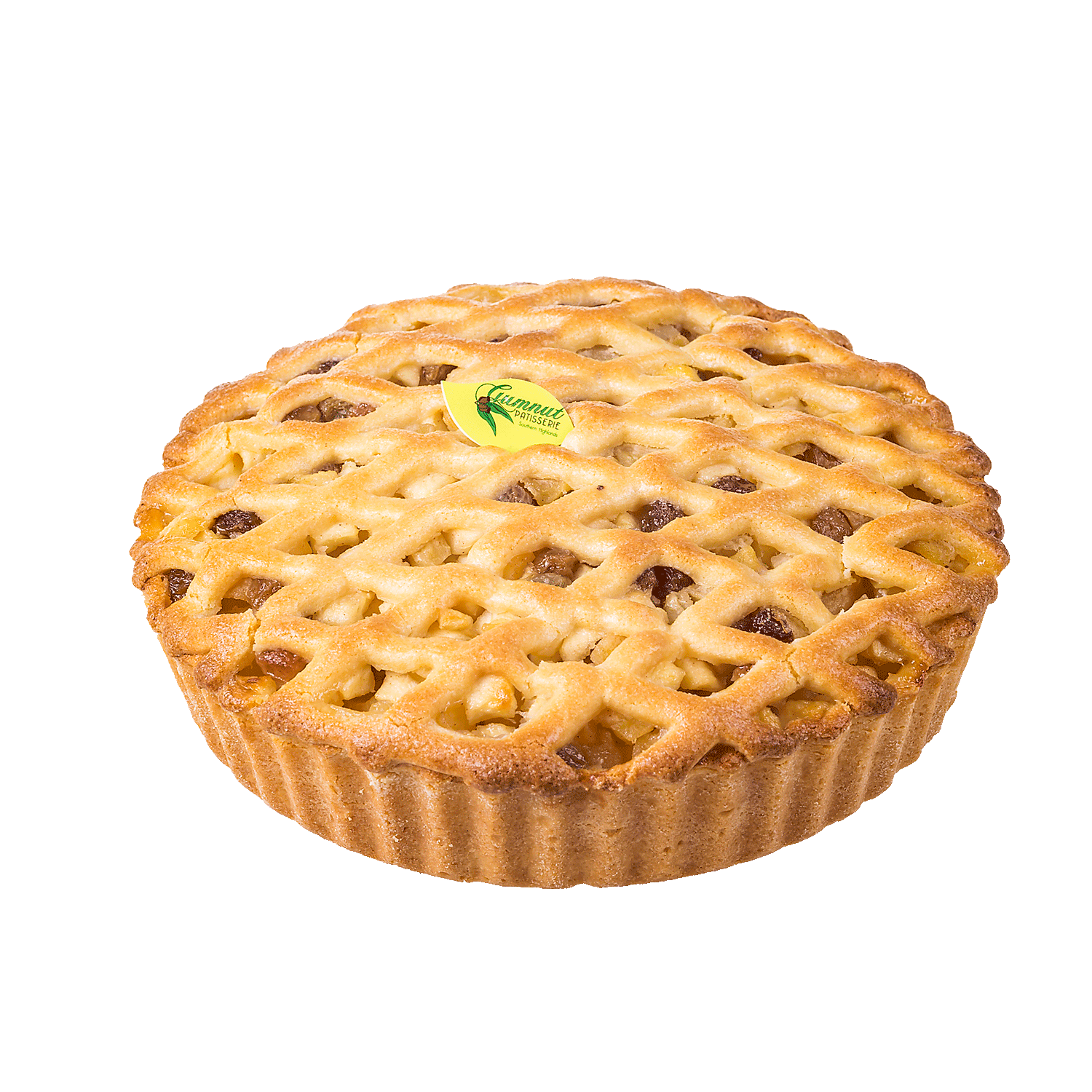 A lovely handmade short crust pastry base filled with a mix of apples, sultanas and cinnamon, topped with a lattice of lightly caramelized short crust pastry.