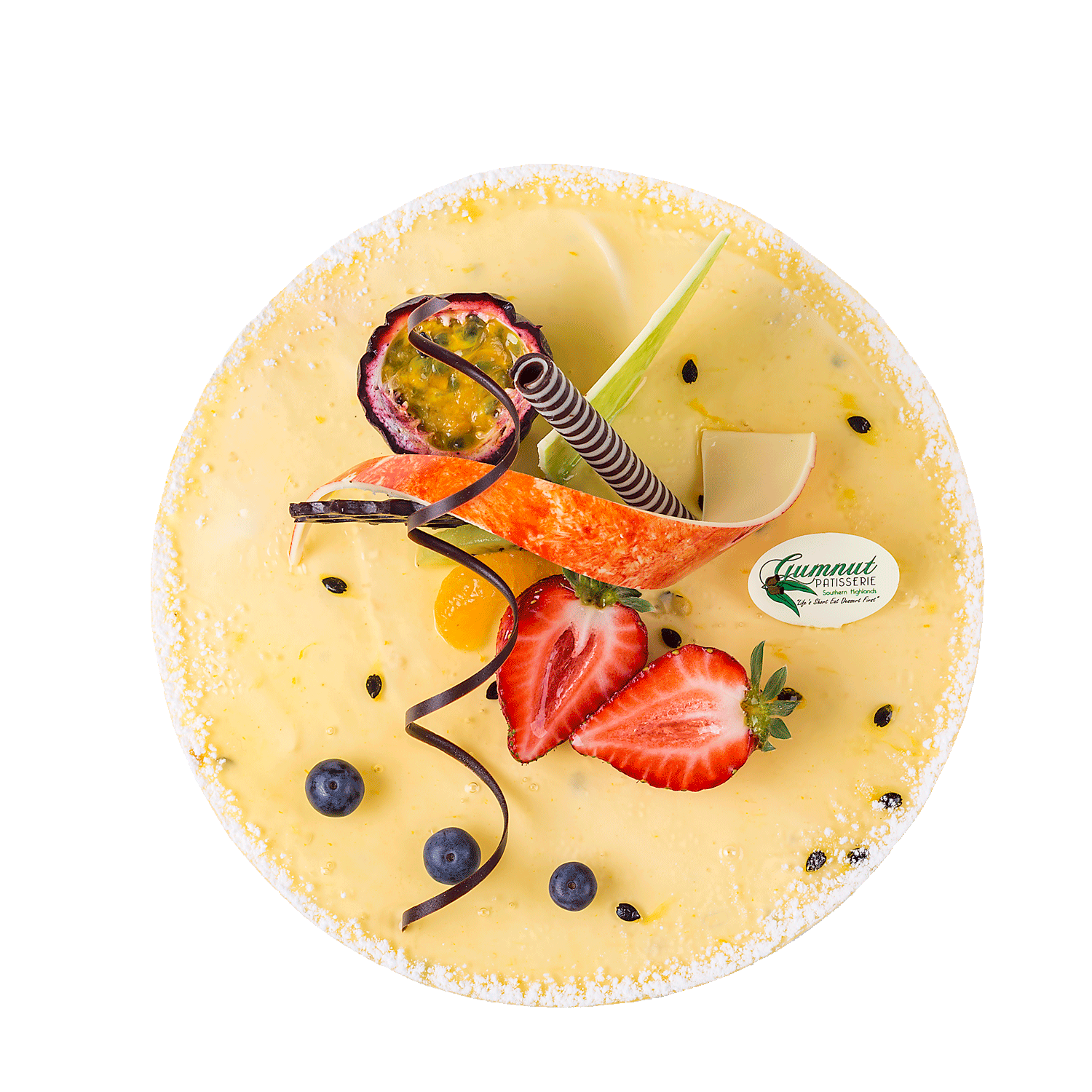 Gumnut Tangy Passionfruit Cheesecake on a biscuit base finished with a passionfruit glaze. Garnished with fresh seasonal fruit and our handmade chocolate decorations.