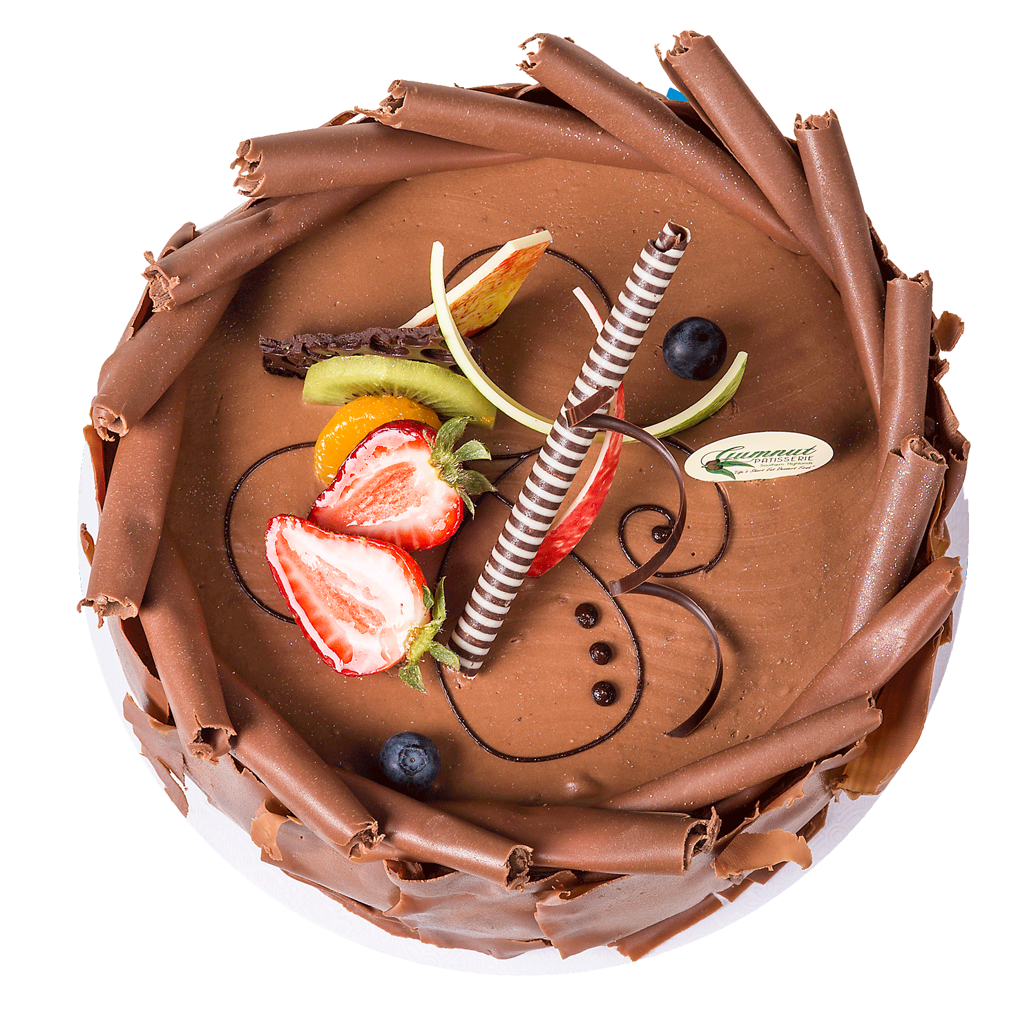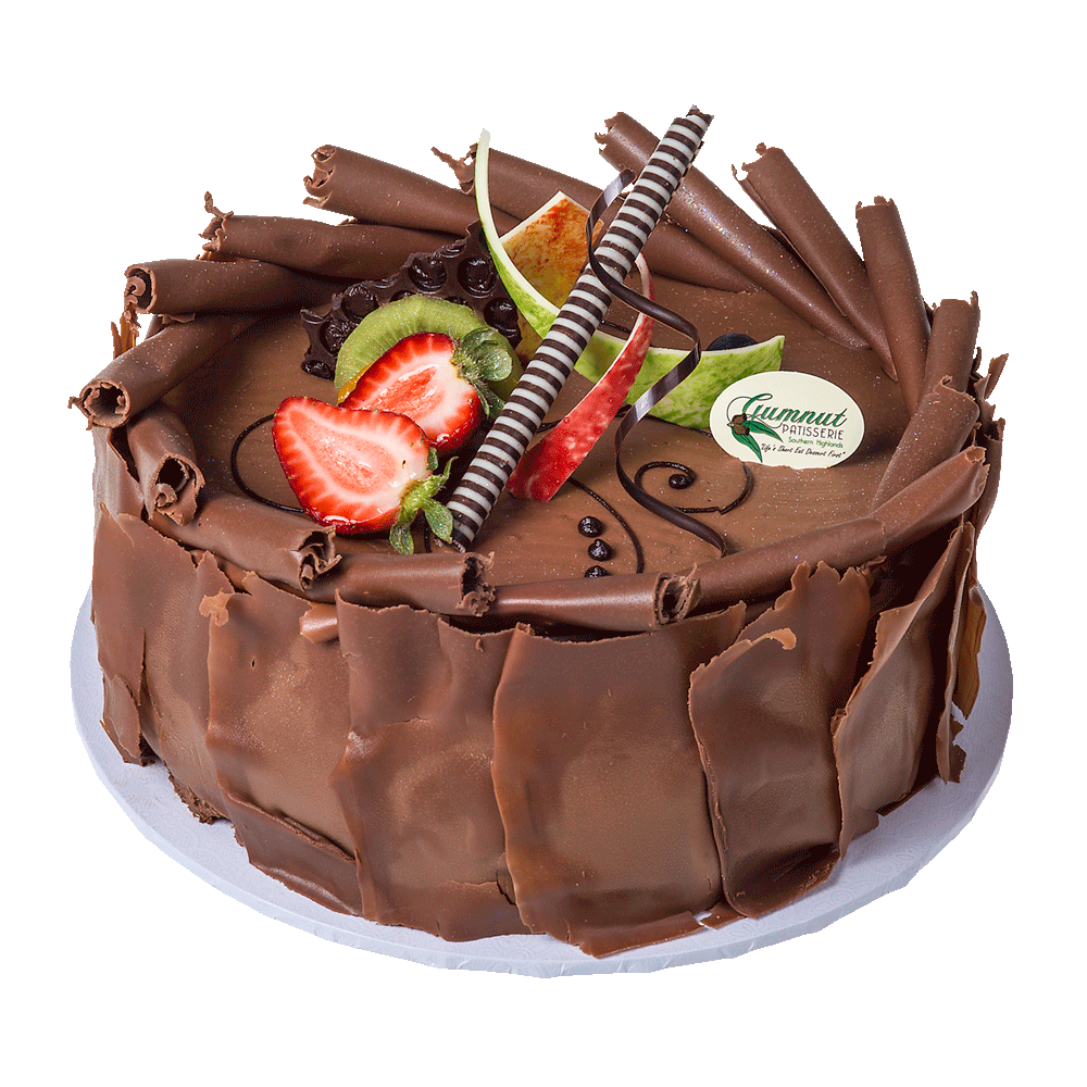 Three layers of chocolate sponge filled with Gumnut chocolate mousse, raspberries and Gumnut jam. Decorated with chocolate shavings and curls and our very own handmade chocolate explosion.
