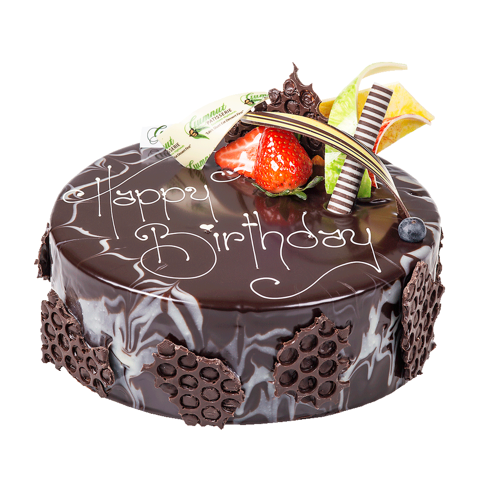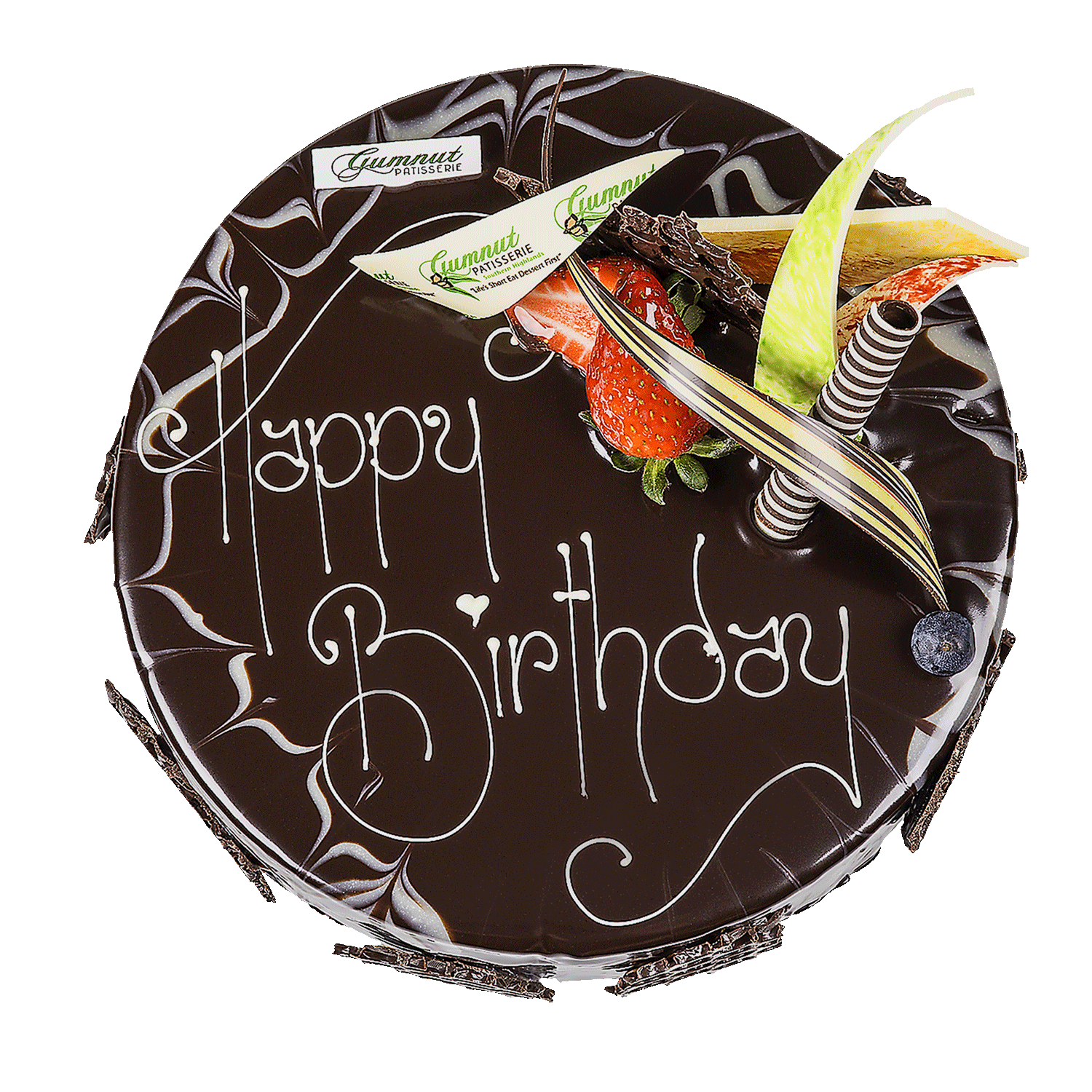 Gumnut’s very own traditional Mud Cake filled & glazed with our chocolate ganache and finished with a touch of our white chocolate ganache. We then garnish with your choice of inscription, our own handmade chocolate decorations and fresh fruit.