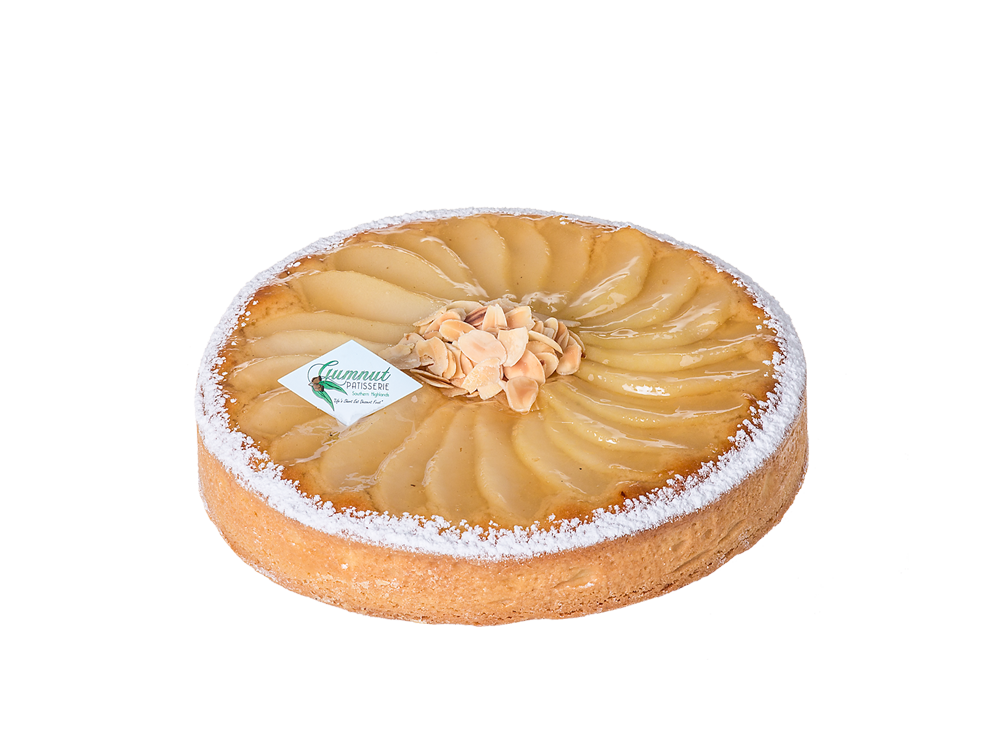 A tasty handmade short crust pastry base filled with Gumnut almond cream and topped with pears then glazed and sprinkled with some toasted almonds.