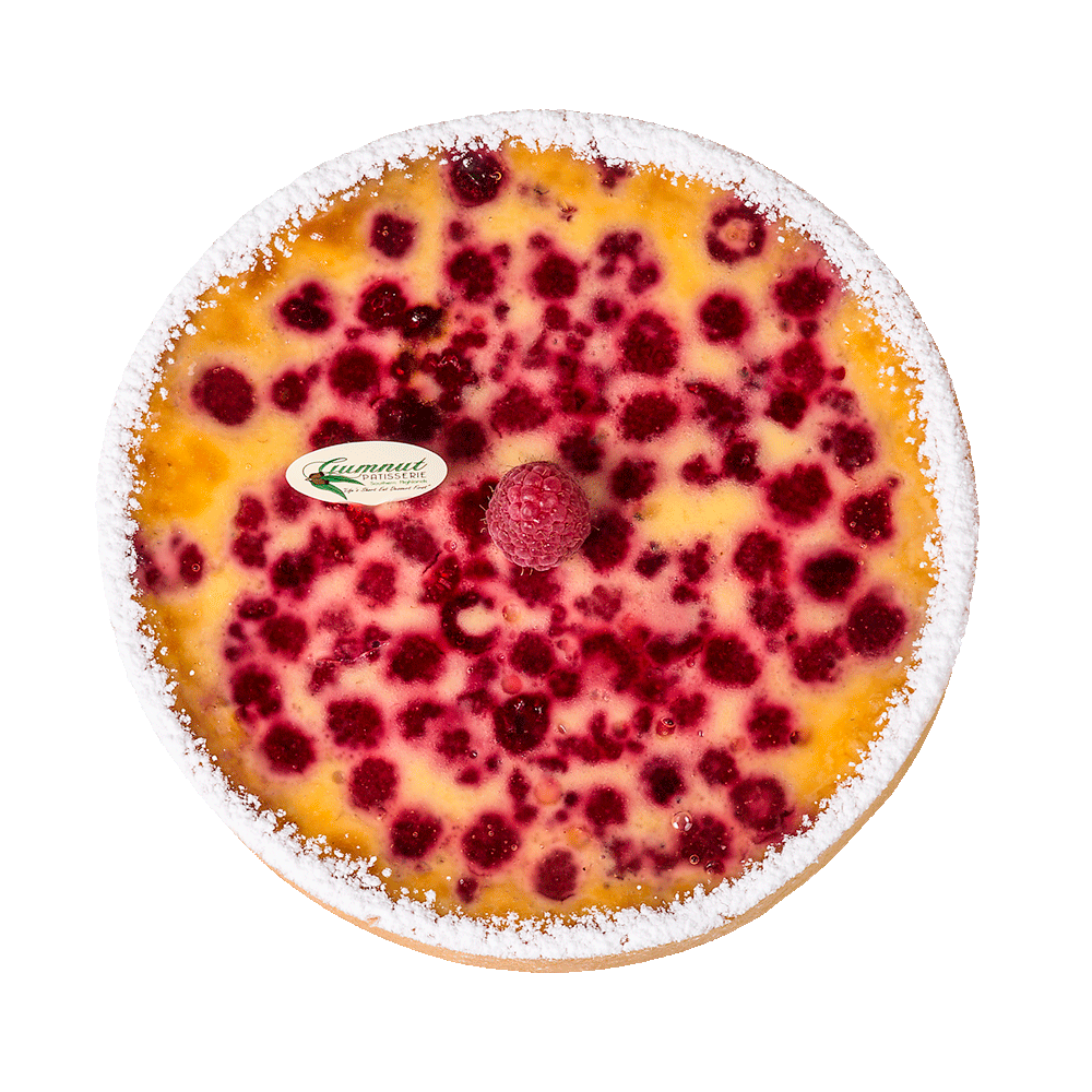 Raspberries arranged on a touch of Gumnut almond cream, filled with our baked custard in a handmade short crust pastry base.