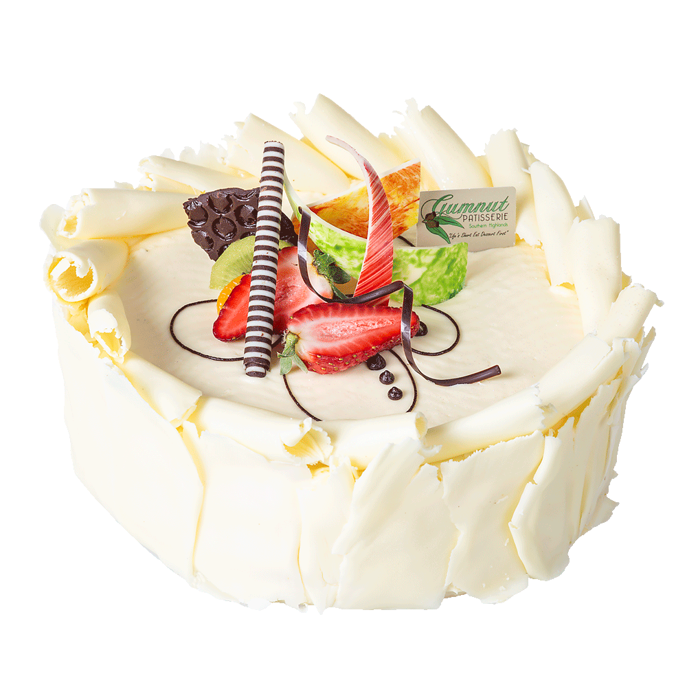 Created with three layers of vanilla sponge filled with white chocolate mousse, raspberries and Gumnut jam. Finished with white choclate shavings and curls and our own handmade chocolate explosion.