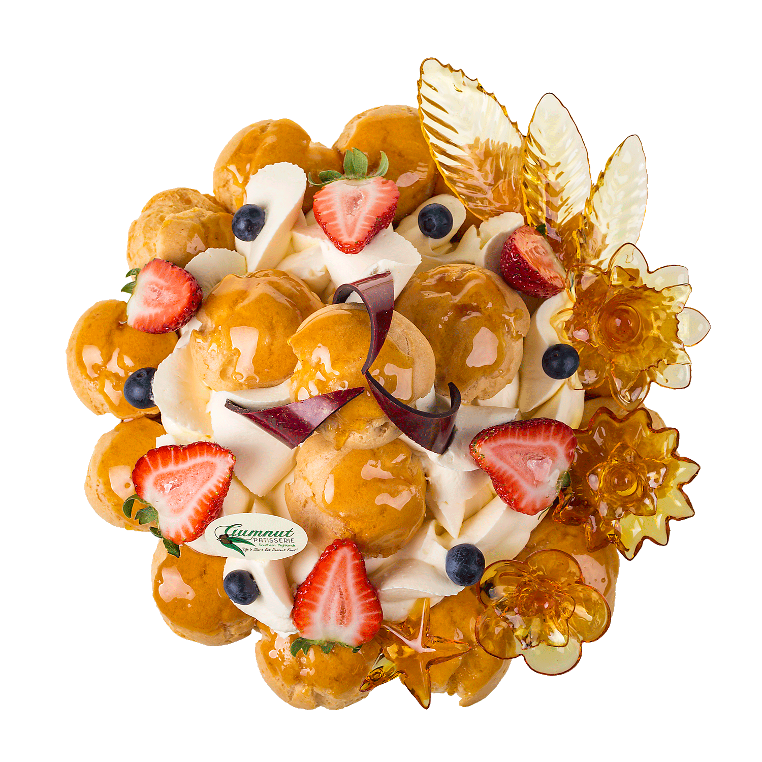filled with Gumnut crême pâtissière in the centre. All topped with fresh whipped cream, strawberries and garnished with handmade chocolate decorations.