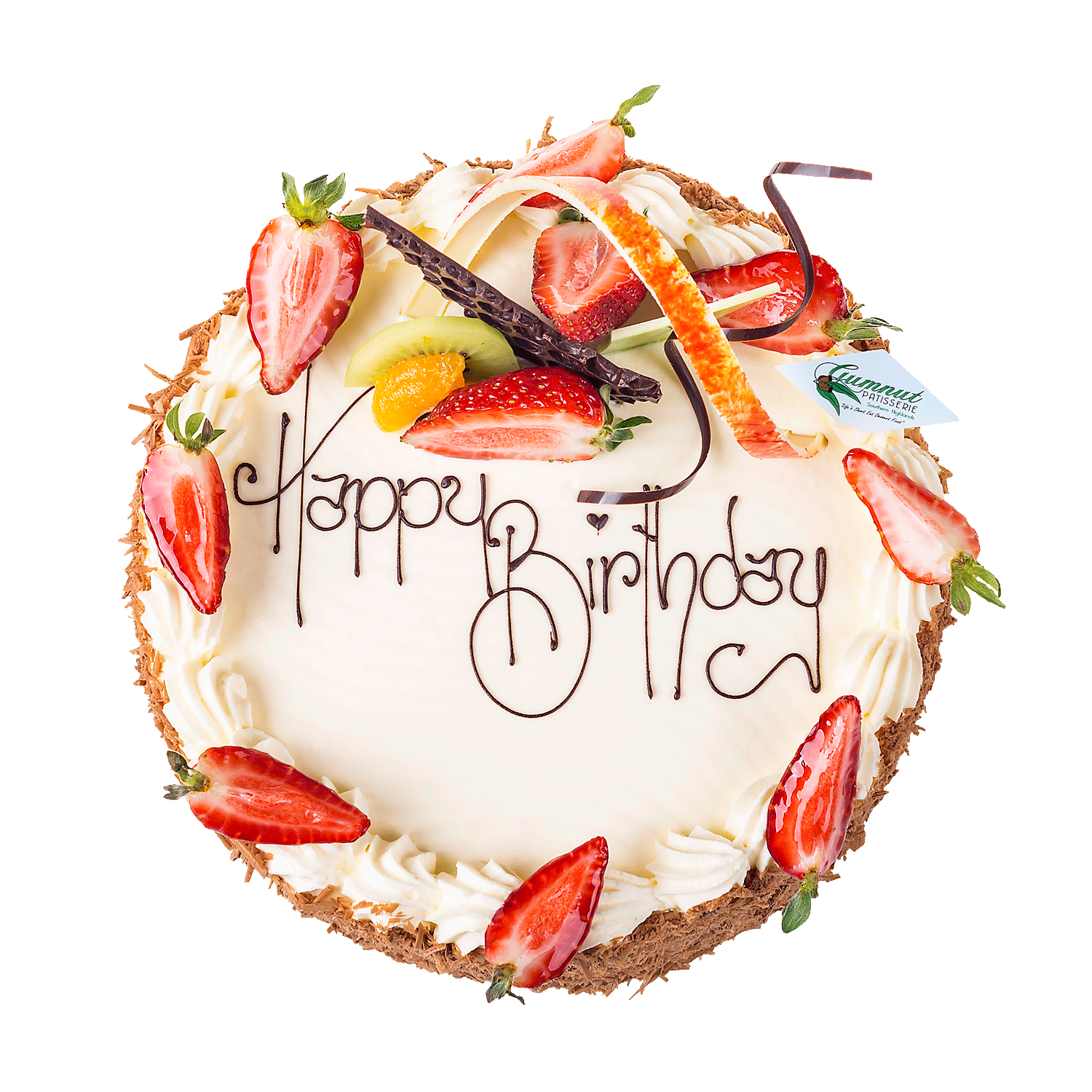 A traditional Vanilla sponge with a layer of Gumnut Homemade Jam, fresh cream and fresh strawberries. We finish this off with yummy chocolate around the sides and topped off with a chocolate inscription, more strawberries and our handmade chocolate decorations.
